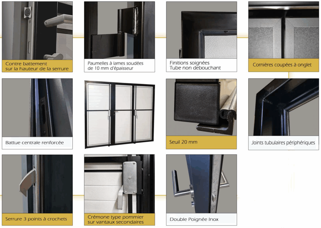 Équipées d’une serrure 3 points et d’une crémone type pompier 2 points pour les vantaux supplémentaires.